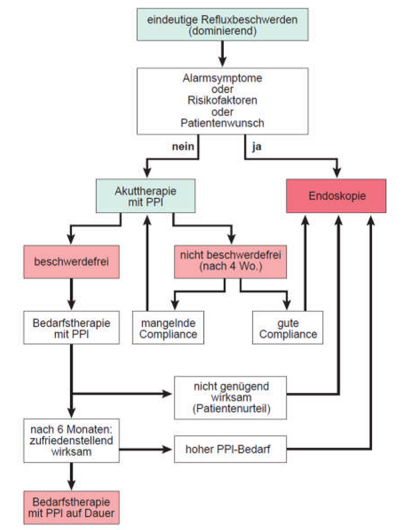 - Bei symptomatischer Refluxösophagitis wird daher ohne weitere Funktionsdiagnostik medikamentös therapiert.