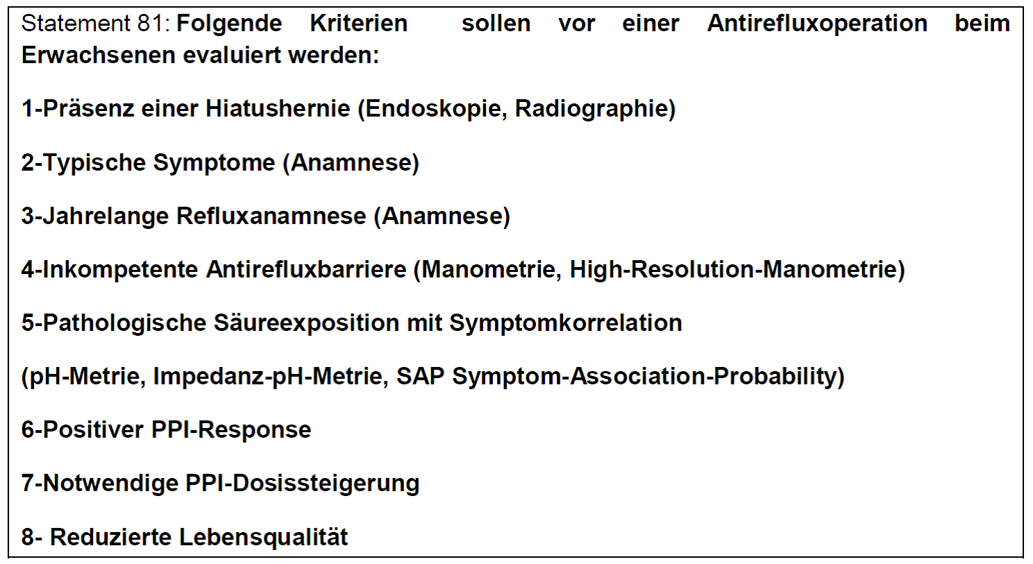 Der Therapieerfolg einer PPI-Therapie ist vergleichbar mit dem einer laparoskopischen Fundoplikatio.Eine Operationsindikation kann gestellt werden, wenn zusätzlich zur langfristigen Behandlungsbedürftigkeit die Indikationskriterien erfüllt sind:
