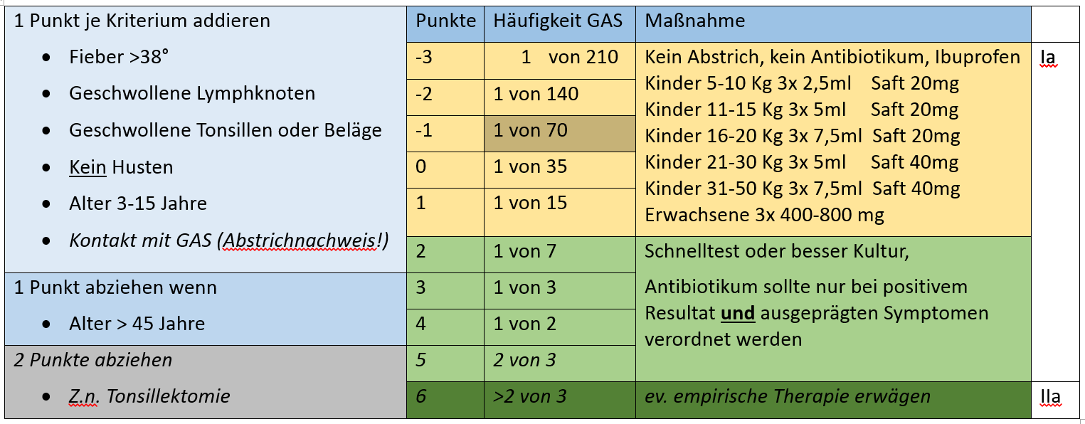 HintergrundINFO: Entsprechend der DEGAM-LL sollte zwischen Pharyngitis, Verdacht auf GAS-Pharyngitis und GAS-Pharyngitis unterschieden werden. Wissenschaftlich erprobte Scores ermöglichen das Abschätzen der Wahrscheinlichkeit einer GAS-Pharyngitis. Wir haben den McIsaak Score auf Grund eigener Studiendaten um 2 Kriterien erweitert - Kontakt mit GAS-Pharyngitis und Zustand nach Tonsillektomie mod. Centor ScoreDer modifizierte Centor Score steht online zur verfügung und ermöglicht eine gemeinsame Entscheidung mit dem Patienten ob: nur Schmerzmittel oder zusätzlich Abstrich - empfiehlt eine antibiotische Therapie nur bei positivem Schnelltest oder positvier Kultur ( jedoch im Gegensatz zu früher nicht mehr empirisch bei hohem Score!)