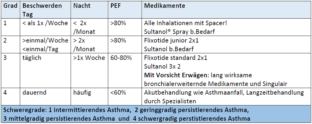 HintergrundINFO: Die Behandlung soll dem aktuellen Schweregrad angepasst sein, bei Verschlechterung wird die nächsthöhere Behandlungsstufe gewählt, nach Besserung geht man wieder eine Stufe zurück, das Prinzip bezeichnet man als „step up / step down“. Bei inhalativem Kortison (ICS) sollte frühestens nach 3 Monaten um eine Stufe zurückgegangen werden!