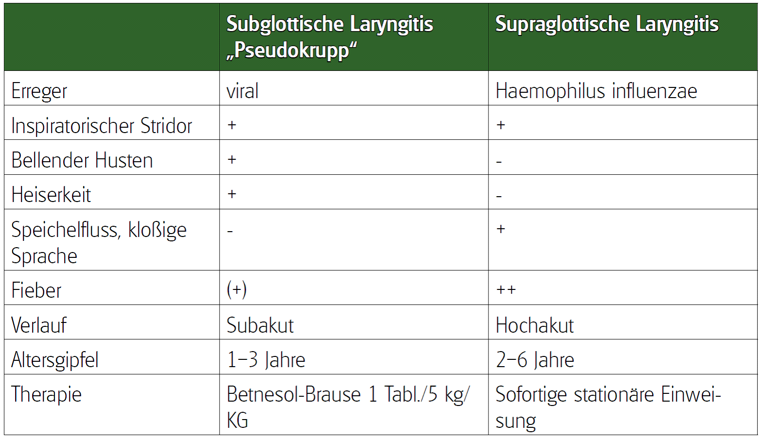 /Infekte in der AM /Pseudokrupp Pseudokruppvon: Christoph FischerSuchbegriffe: subglottische Laryngitis, Epiglottitis, Pseudokrupp, Stridor Häufigkeit: 10-15% aller Kinder erkranken mindestens 1x an Pseudokrupp, Epiglottitis 1:500.000 / Jahr Äthiologie: Pseudokrupp banale Atemwegsviren, Epiglottitis meist Hämophilus B Symptomesubglottisch LaryngitisKind meist zwischen 6 Monaten und 3 Jahren mit starker Heiserkeit, bellend trockenem Husten und inspiratorischem Stridor EpiglottitisAltersgipfel 2-6 Jahre, starker Speichelfluss durch die Schluckstörung, hohes Fieber, hochakuter Verlauf, aber keine heisere Sprache UntersuchungCAVE: Bei Epiglottitis kann bereits die Inspektion des Halses zu einem reflektorischen Bronchospasmus führen, der die sofortige Intubation erforderlich macht. Bei Verdacht auf Epiglottitis (extrem selten aber gefährlich) sollte die Einweisung ohne Untersuchung erfolgen.