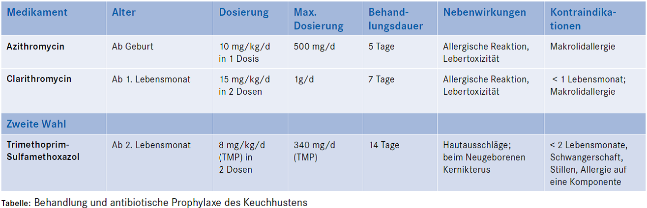 Antibiotische Prophylaxe:Bei Kontakt mit Pertussis vor weniger als 21 Tagen unabhängig von Alter, Impfstatus und Antikörperspiegel:
