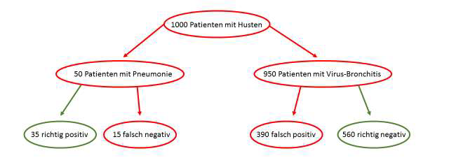 Erläuterung: an dem Beispiel von 59% werden wir also bei 41 von 100 Patienten die keine Pneumonie - sondern eine Virus-Bronchitis haben ein CRP >40mg/L finden. Wie hoch ist damit positiver und negativer Vorhersagewert des CRP, wenn von 1000 Erkrankten 950 eine virale Bronchitis haben, und 50 eine Pneumonie (das entspricht einer Prävalenz von 5%)?